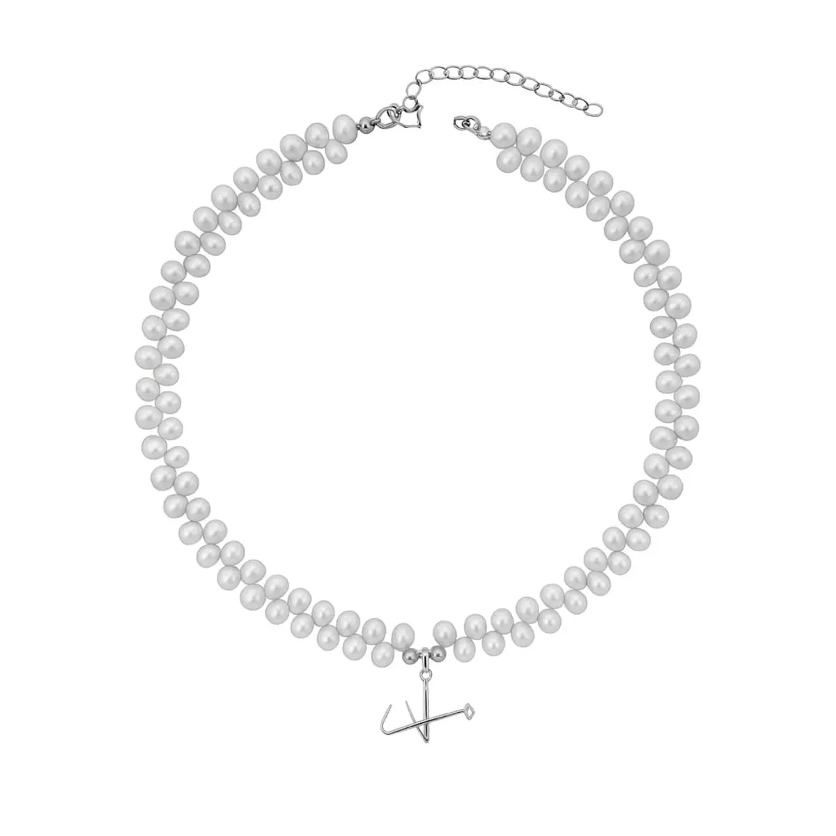 Collar de perlas dobles Valiant Vestes con el logotipo de Valiant Vestes en plata de ley colgando de la colección de joyas.
